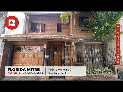 <p>VENTA CASA 5 AMBIENTES EN FLORIDA MITRE</p><p><br></p><p>Casa de 5 ambientes en 2 plantas con fondo y piscina a metros de Av. Maipú. Con fácil y rápido acceso a Gral. Paz y Panamericana, centro comercial y Metrobús.</p><p><br></p><p>La propiedad es de solida construcción con excelente carpintería en ventanas y pisos.</p><p>La calefacción es por caldera en loza radiante lo que da una calidez superior a los ambientes. Posee 4 aires acondicionados frío/calor y otros detalles de categoría.</p><p><br></p><p>Desarrollada en 2 plantas.</p><p>Planta baja:</p><p>Garage para 1 auto con portón levadizo.</p><p>Comedor diario.</p><p>Toilette.</p><p>Amplio living con hogar.</p><p>Hall de distribución.</p><p>Cocina con muebles completos.</p><p>Galería cubierta.</p><p>Amplio fondo libre.</p><p>Parrilla.</p><p>Piscina con filtro.</p><p><br></p><p>Planta alta:</p><p>Acceso por escalera.</p><p>Hall de distribución amplio.</p><p>3 cómodos dormitorios muy luminosos con espacio de guardado.</p><p>1 escritorio o 4to dormitorio.</p><p>Baño.</p><p>Toilette.</p><p><br></p><p>Apto crédito.</p>